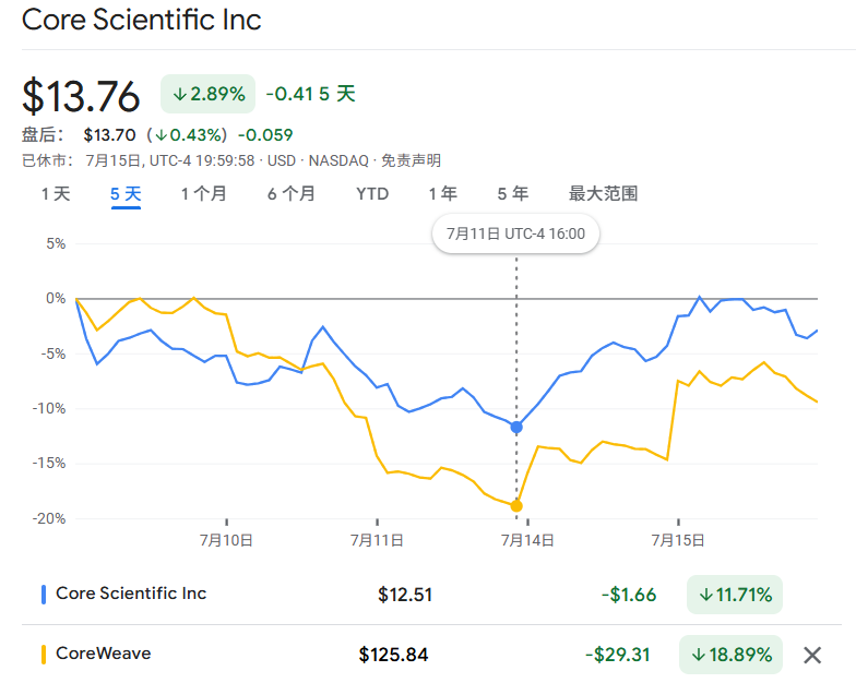 自7月7日宣布收购消息以来,Core Scientific股价累计下跌25%,周一止住了连续五日的跌势,但市值已缩水至60亿美元,较CoreWeave提供的股票价值低12亿美元。而更令人意外的是,作为收购方的CoreWeave股价同期也下跌20%,市值蒸发超过120亿美元。